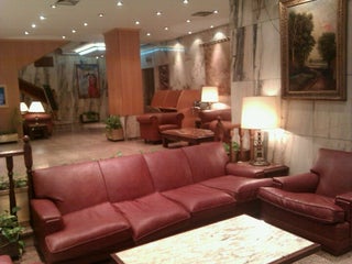 Sad couches and chairs in the lobby. Hotel is old and worn but good enough for a short visit